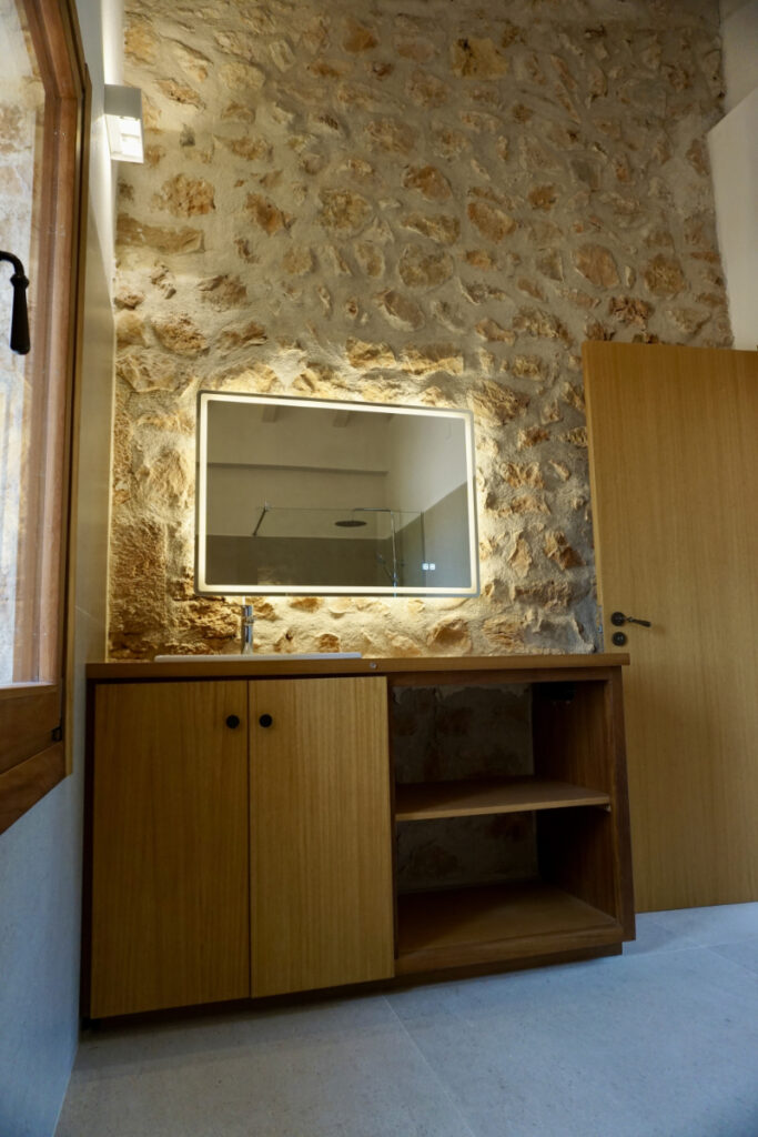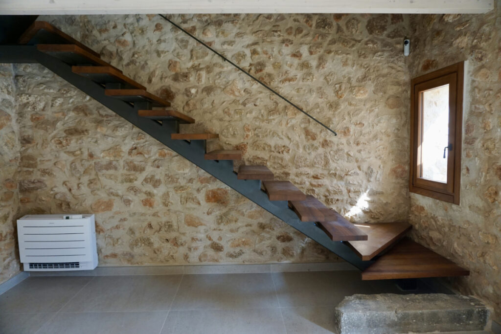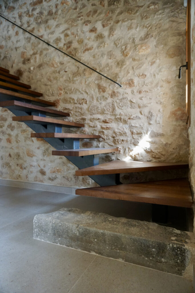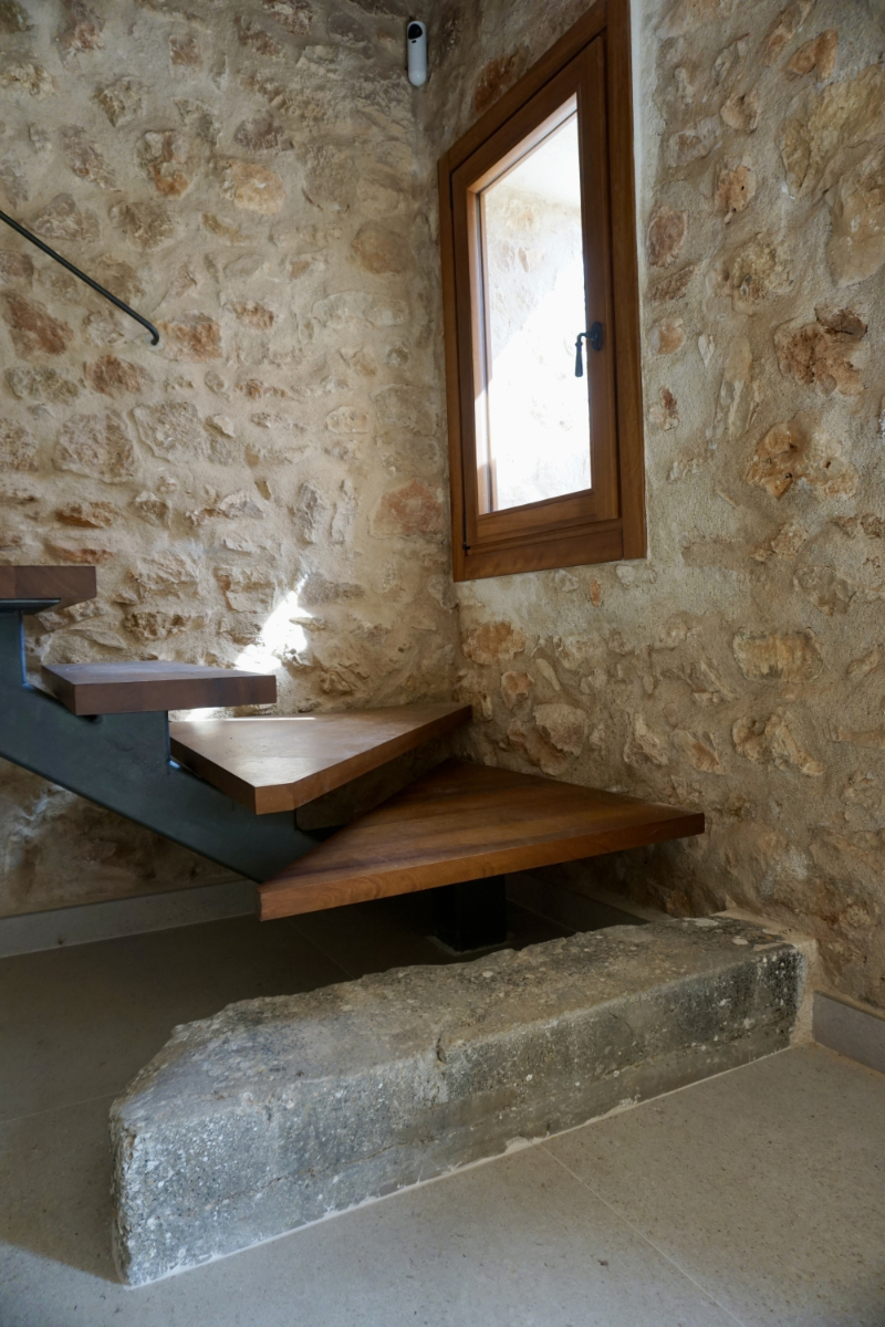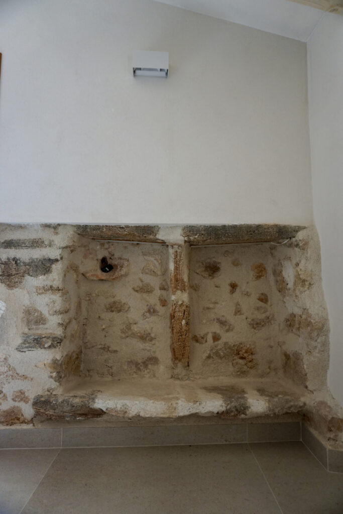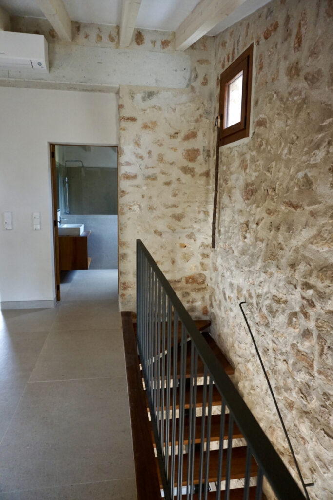 Originalelemente wie der ehemalige Schweinestall, ein traditioneller Holzbackofen, Natursteinmauern sowie eine Treppenstufe aus einer alten Kirche wurden erhalten und stilvoll in die moderne Gestaltung integriert. Hochwertige Naturmaterialien bieten Komfort und Qualität zugleich.
