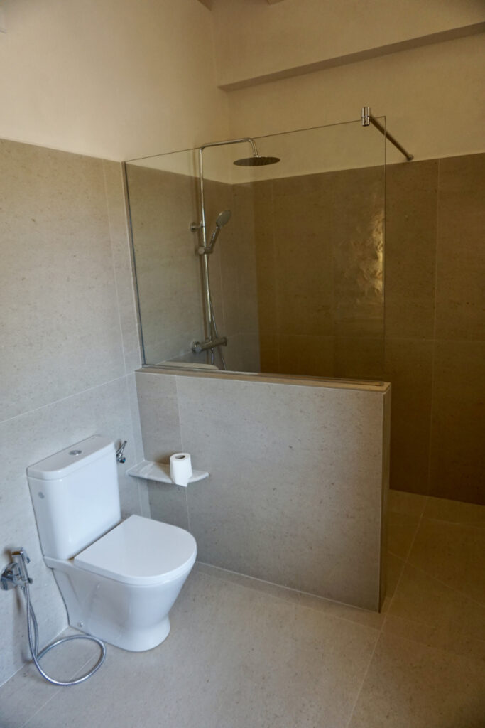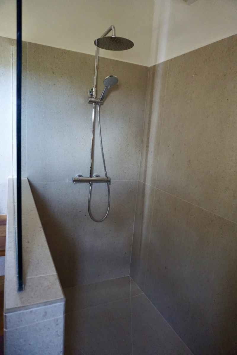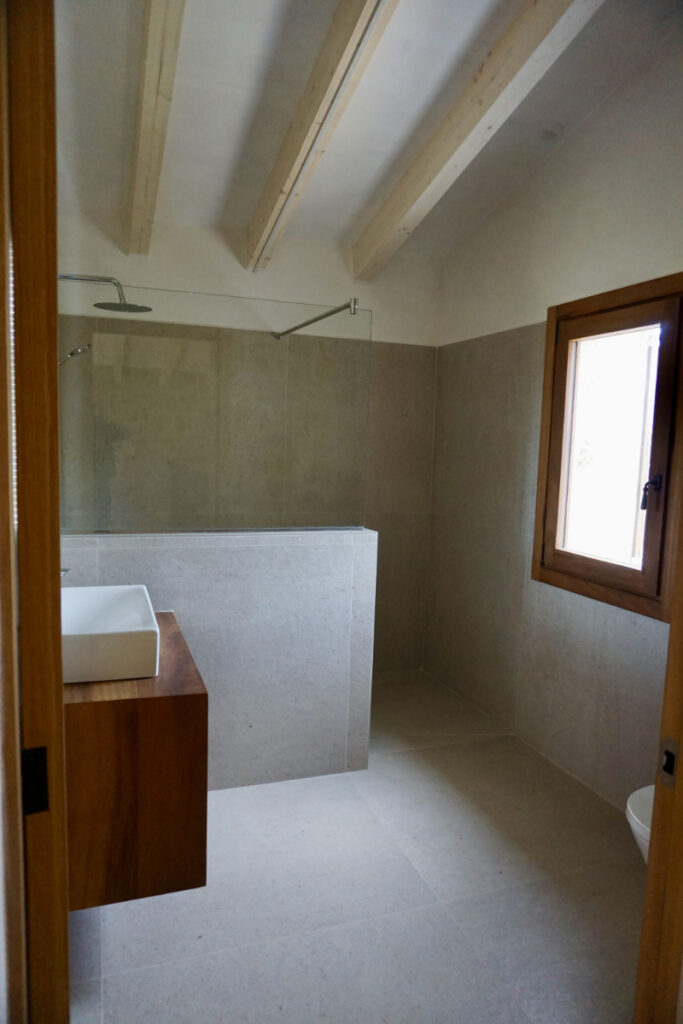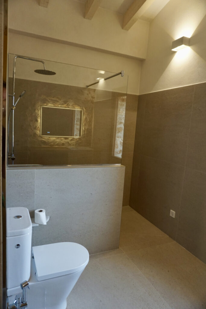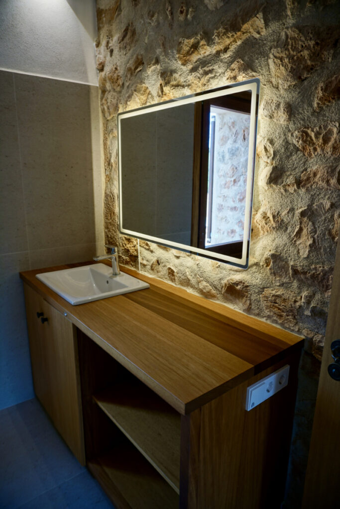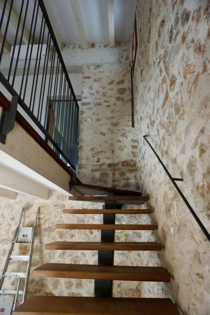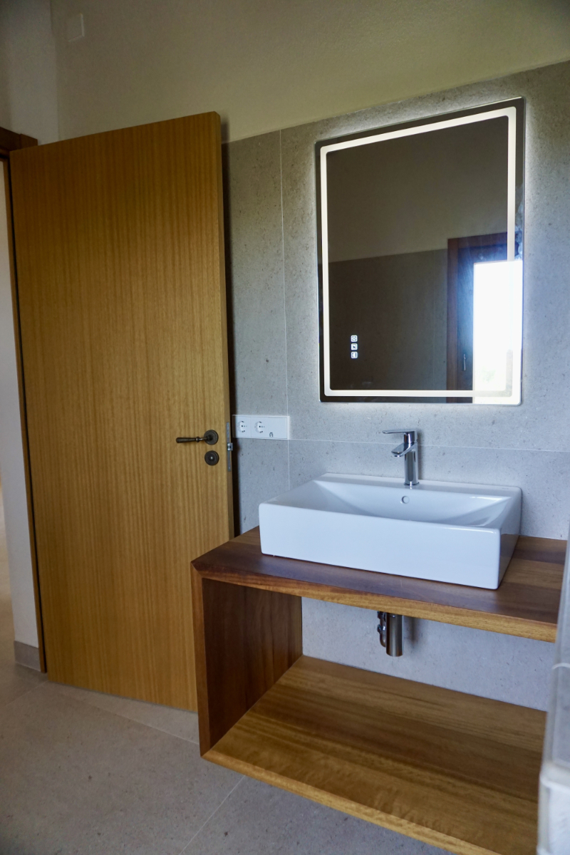 Originalelemente wie der ehemalige Schweinestall, ein traditioneller Holzbackofen, Natursteinmauern sowie eine Treppenstufe aus einer alten Kirche wurden erhalten und stilvoll in die moderne Gestaltung integriert. Hochwertige Naturmaterialien bieten Komfort und Qualität zugleich.